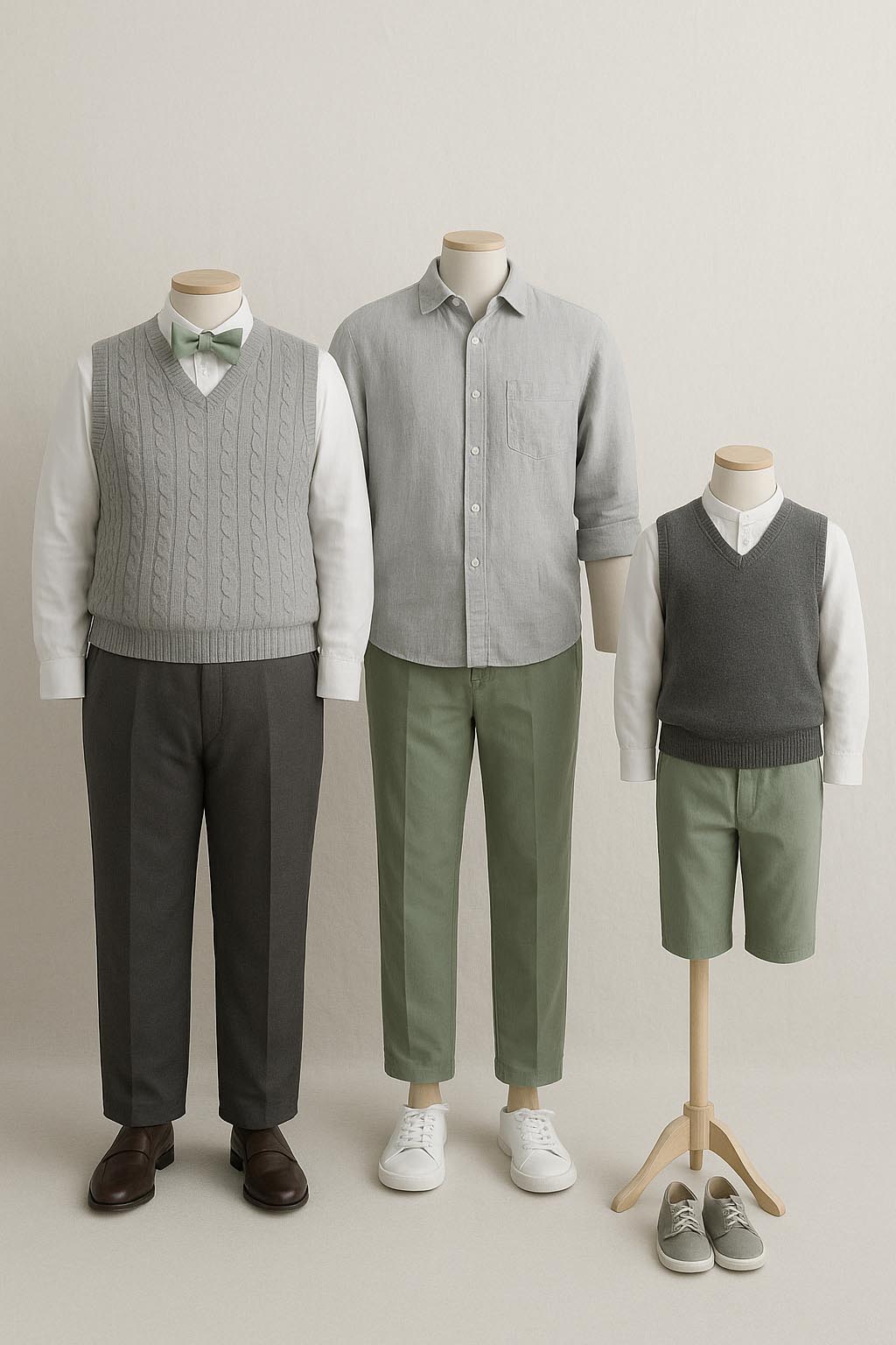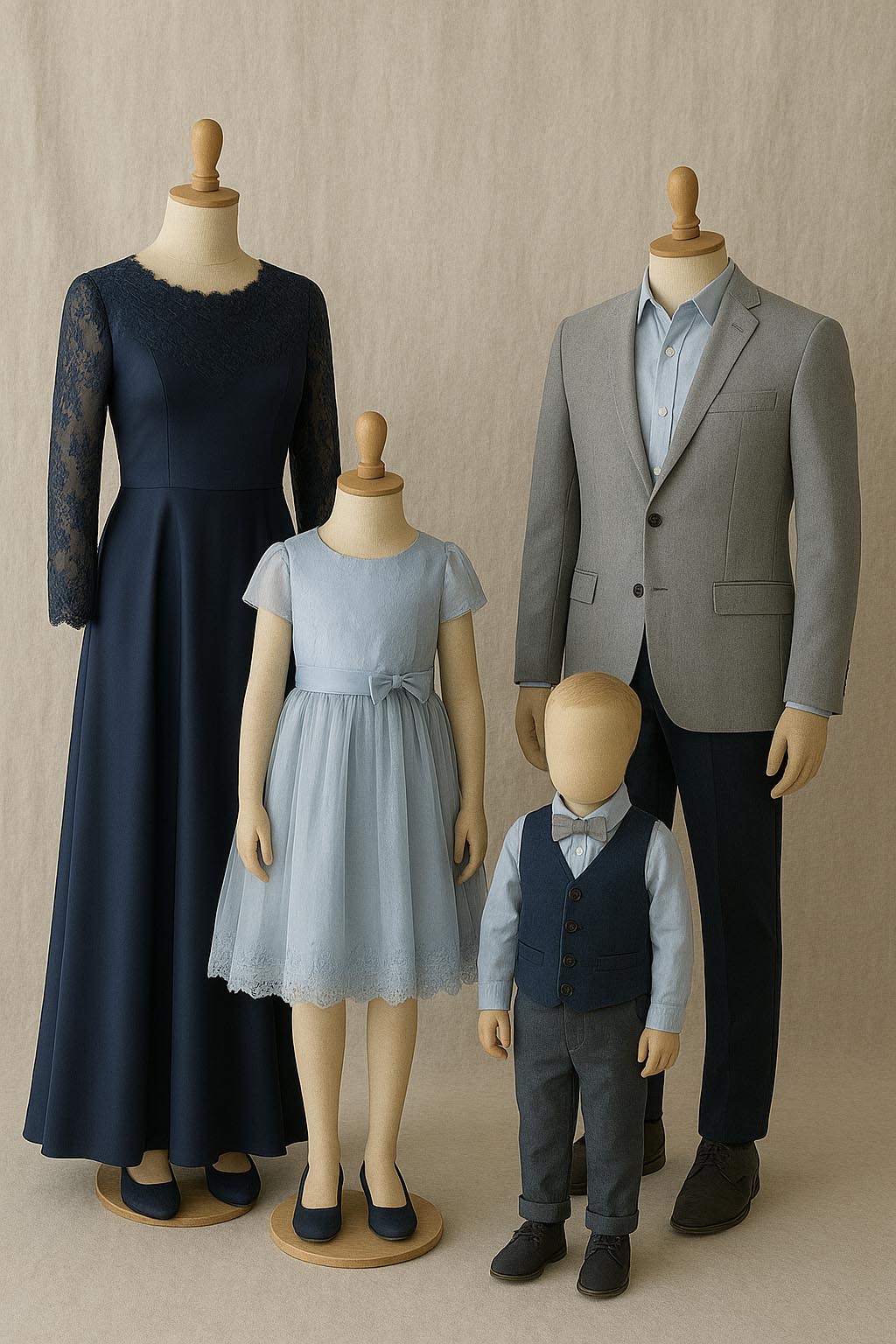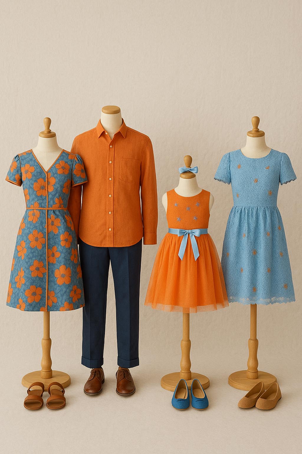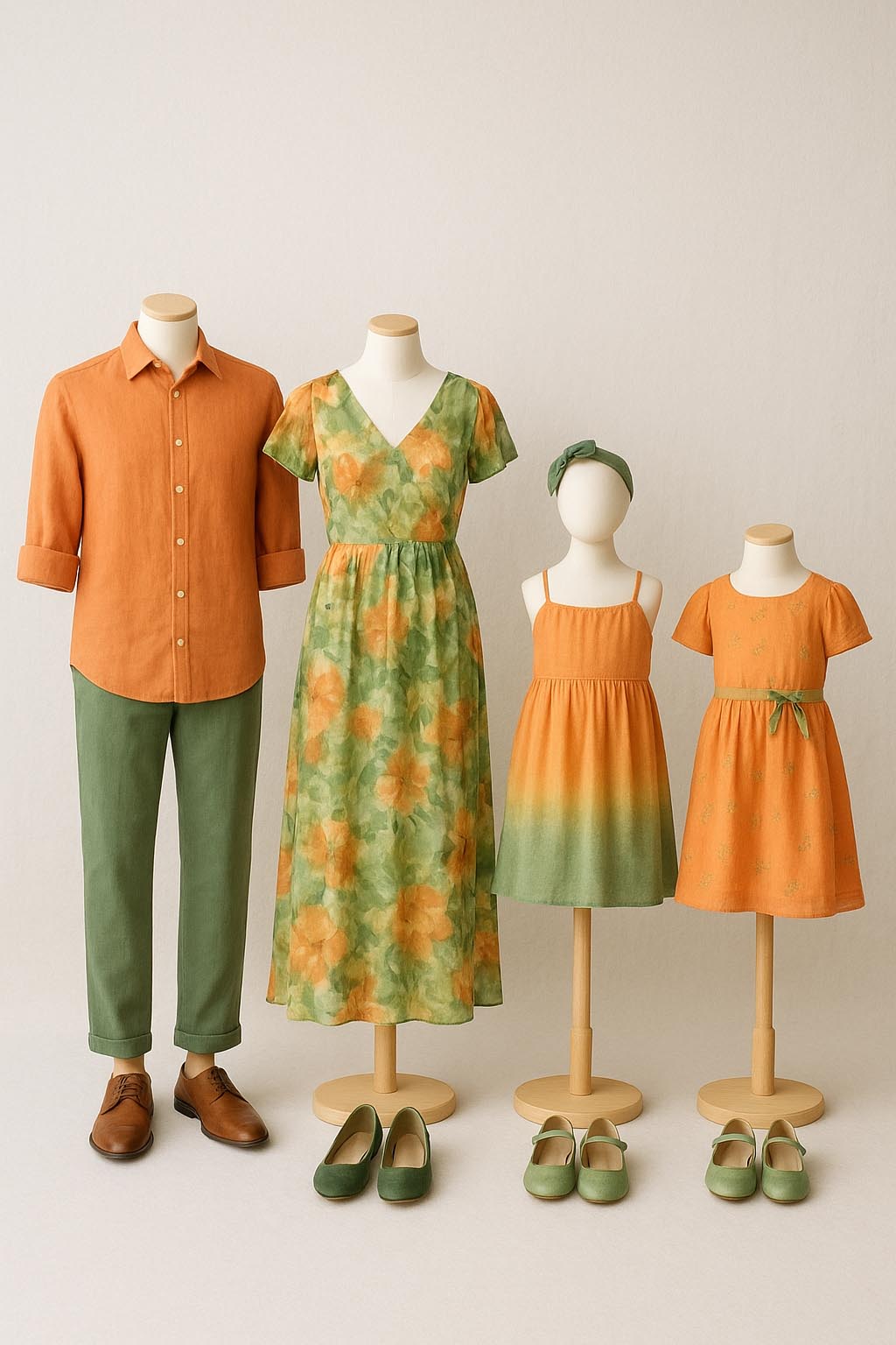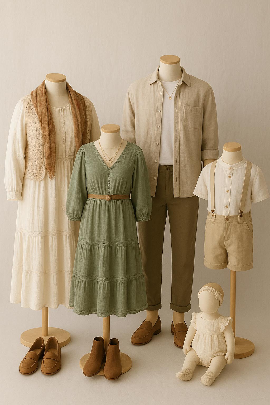 When choosing colours for a photoshoot, harmony is key. Soft, natural tones blend beautifully and let faces and emotions shine. For a richer look, combine deep shades such with neutrals like sand or light grey. Think of a balanced palette where every outfit complements the others, creating a cohesive, timeless look that feels calm and effortlessly stylish.