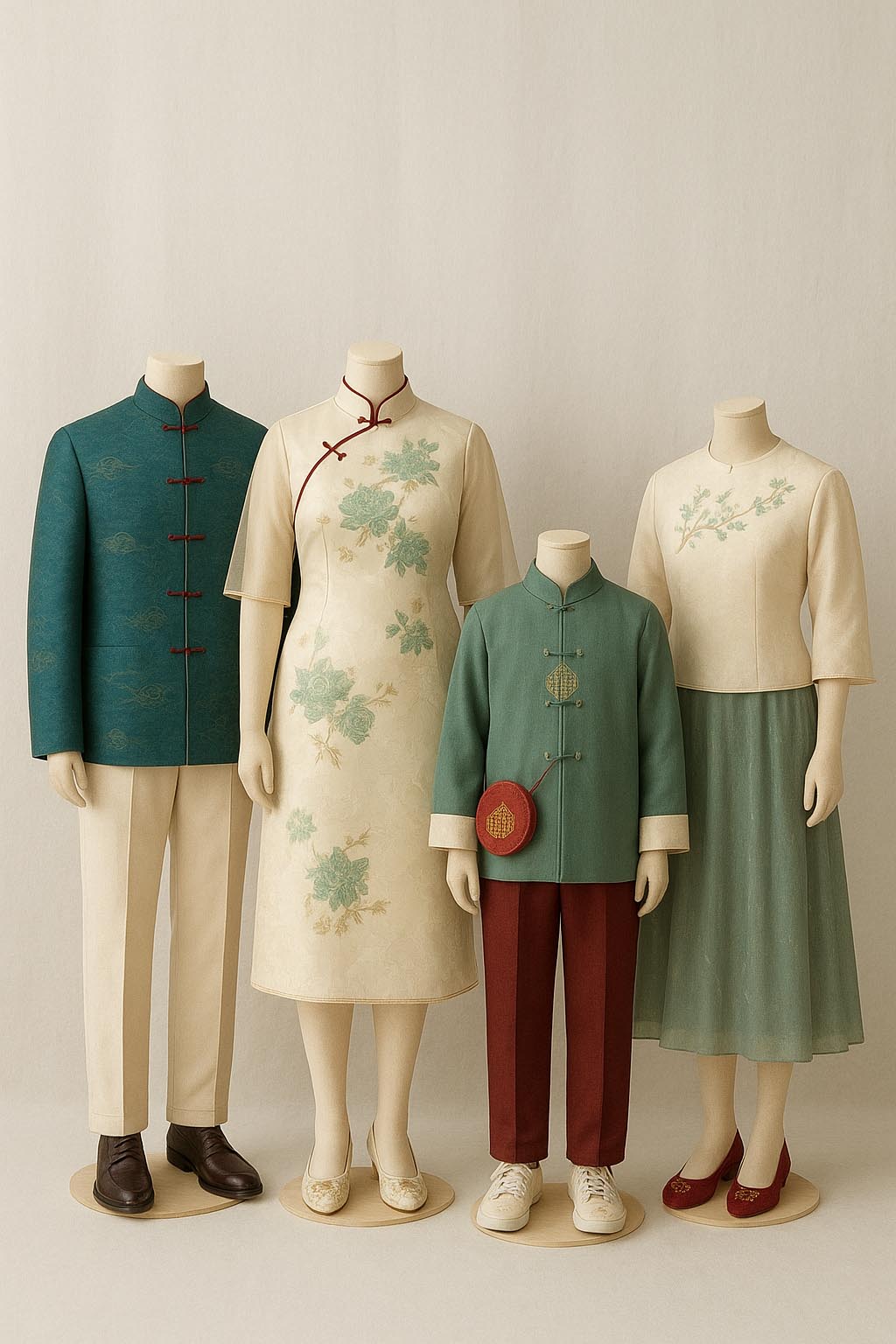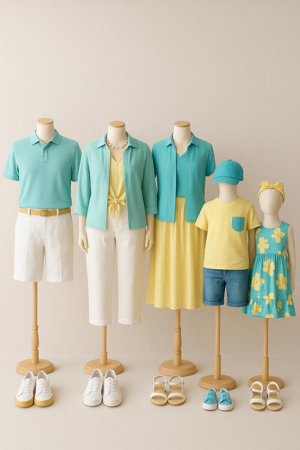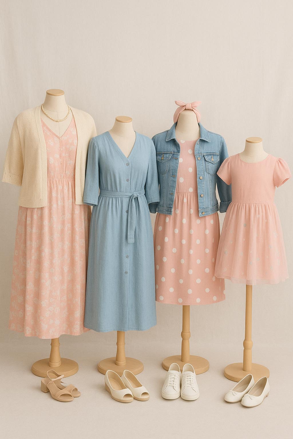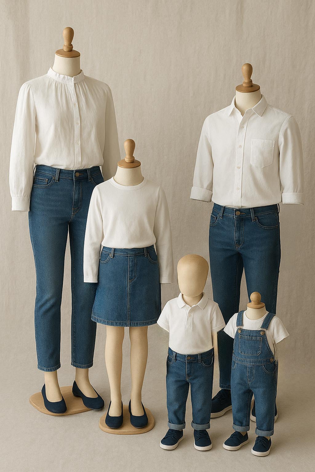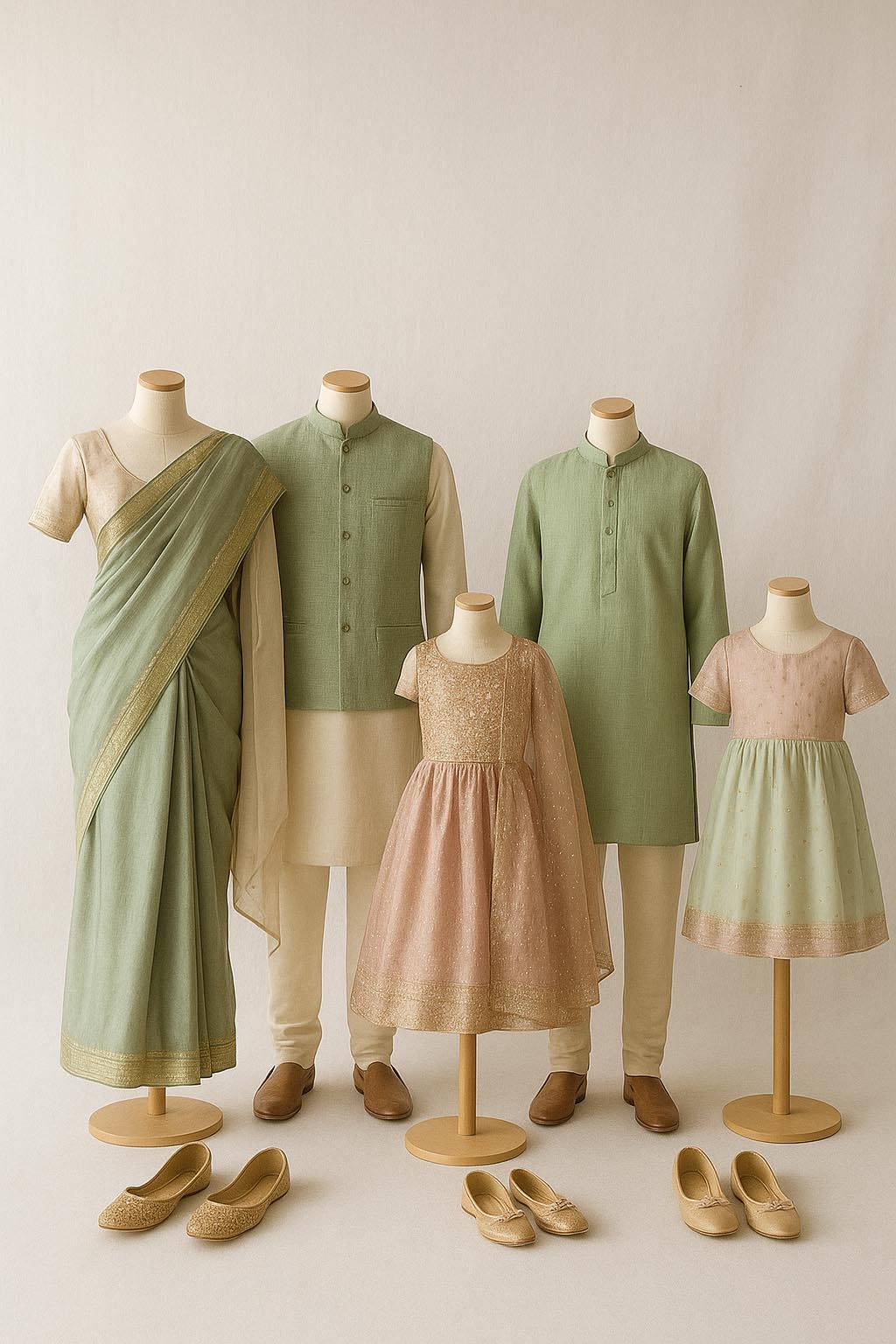When choosing colours for a photoshoot, harmony is key. Soft, natural tones blend beautifully and let faces and emotions shine. For a richer look, combine deep shades such with neutrals like sand or light grey. Think of a balanced palette where every outfit complements the others, creating a cohesive, timeless look that feels calm and effortlessly stylish.